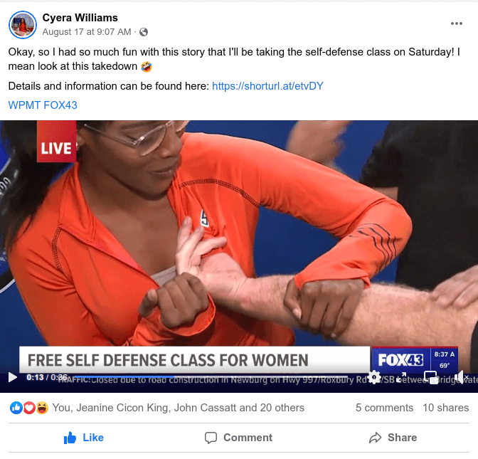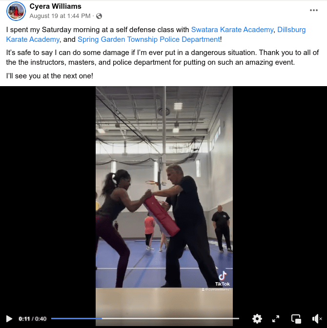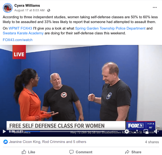 Fox 43 8/19/23: https://www.fox43.com/article/entertainment/events/spring-garden-police-swatara-karate-academy-free-self-defense-classes/521-b073225d-9ba3-4baf-9b85-bd6a652f64b5